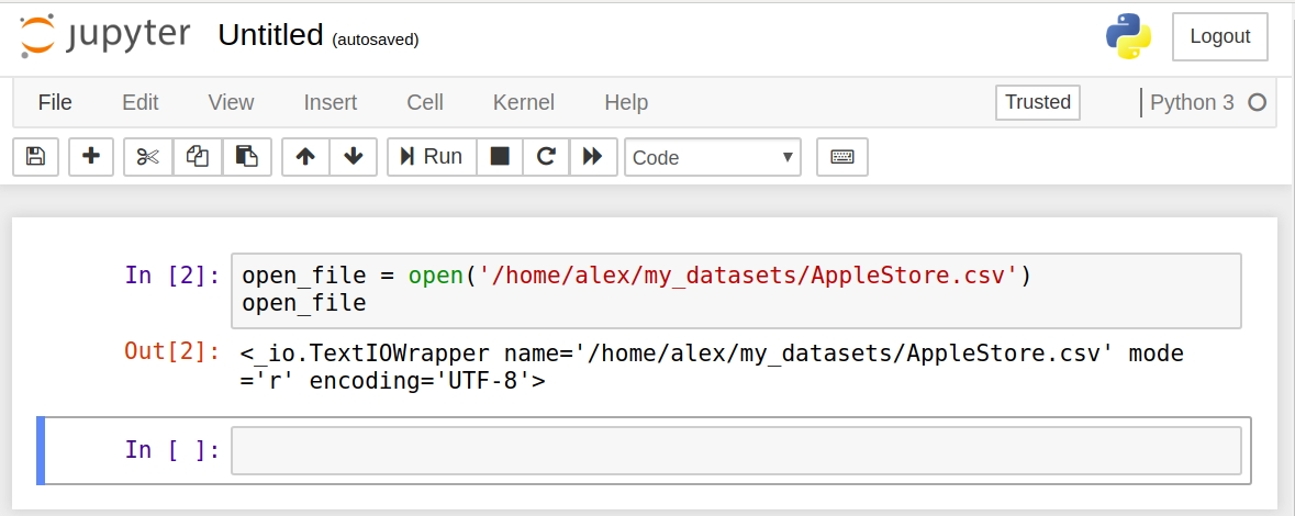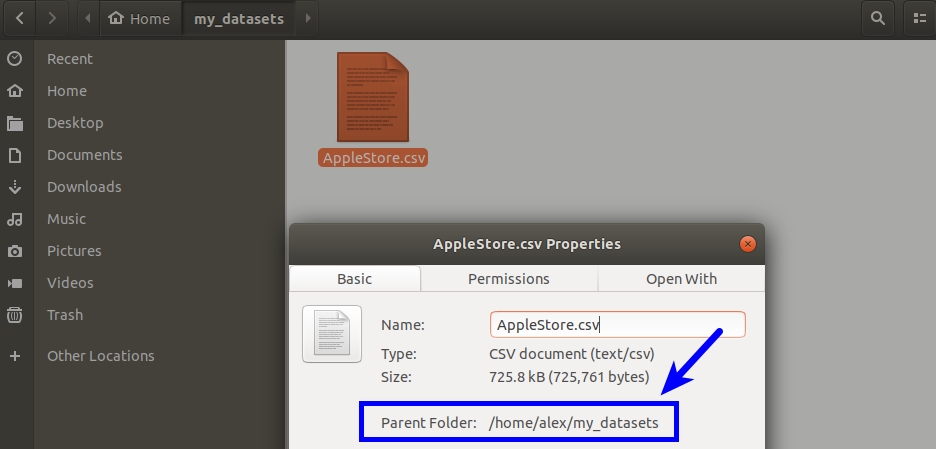 /home/alex/my_datasets(whereAppleStore.csvis located) and runopen('AppleStore.csv')from there.We can copy the