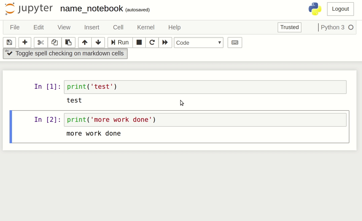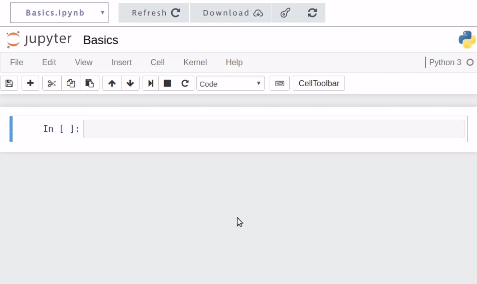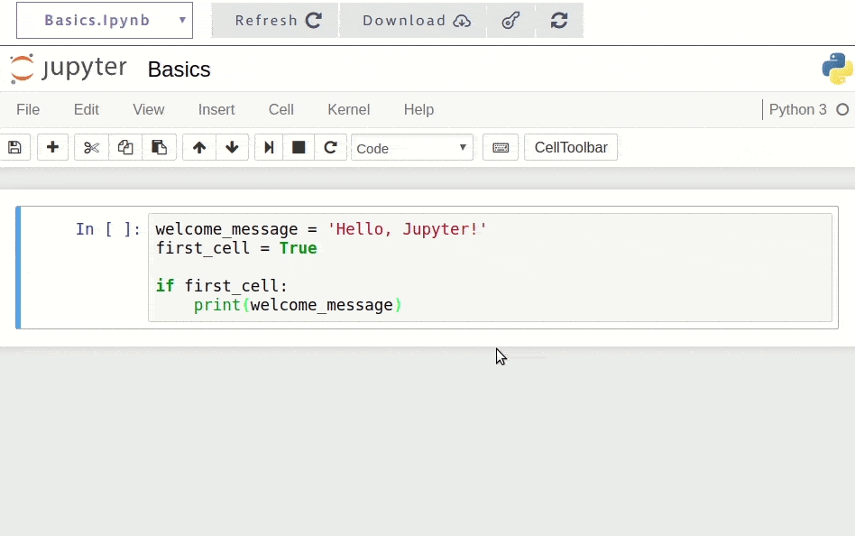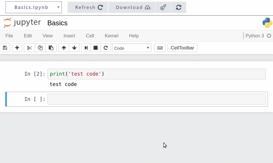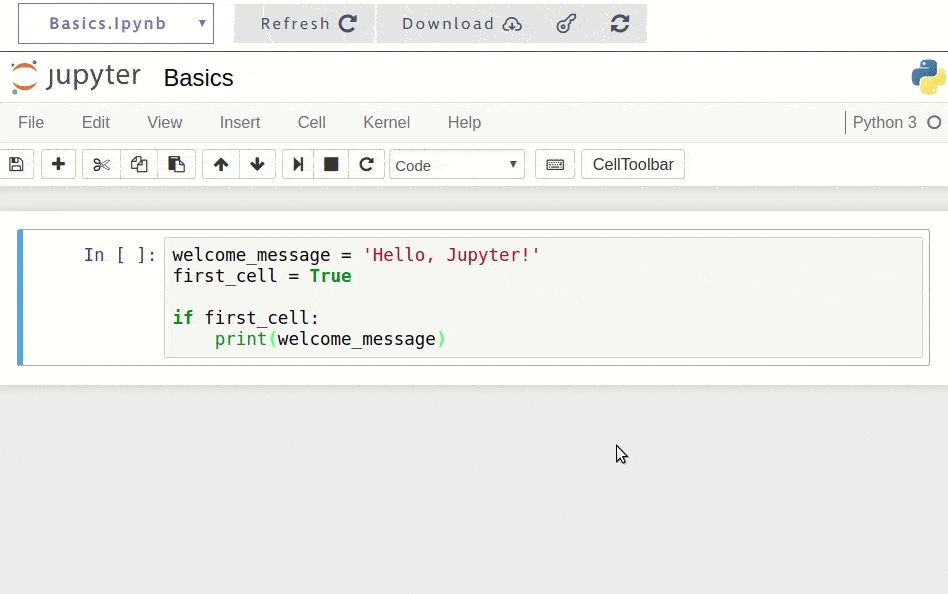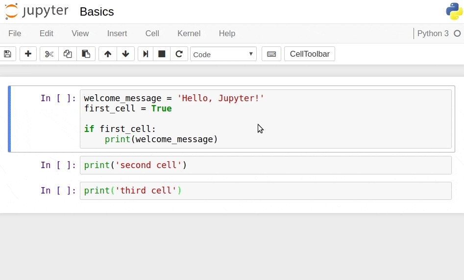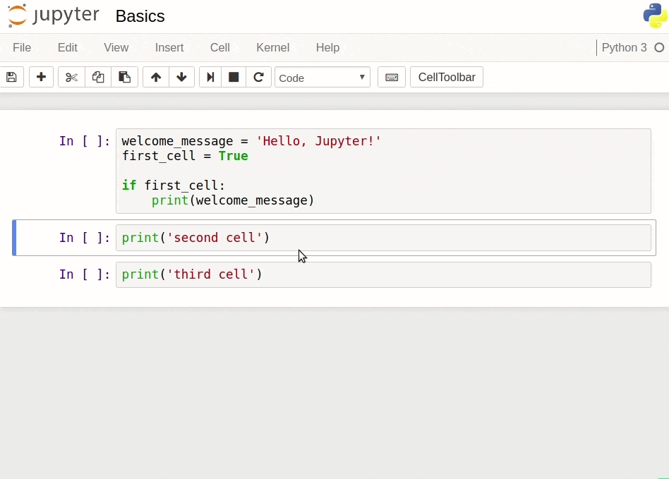 print('Third cell')toprint('Second cell'). You can move the cursor using Up, Down, Left, and Right.Run the code in this second cell without creating any new cell below.