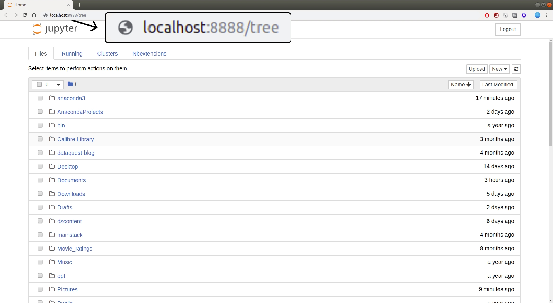As soon as you launch Jupyter, a new web page pops up in the browser. Jupyter is a web application, which means it runs in the browser. A new server is created at localhost:8888, the URL you see in the browser.
