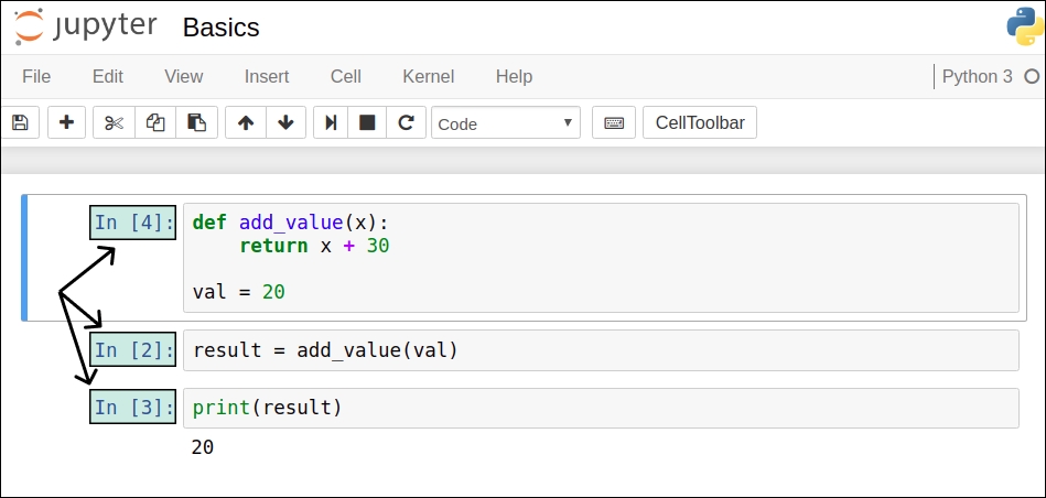All the code cells of a Jupyter notebook share the same state. In our code example above, add_value(), val, and result are available across different cells because these different cells share the same state.
