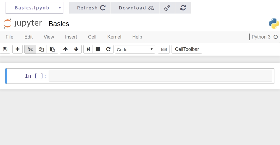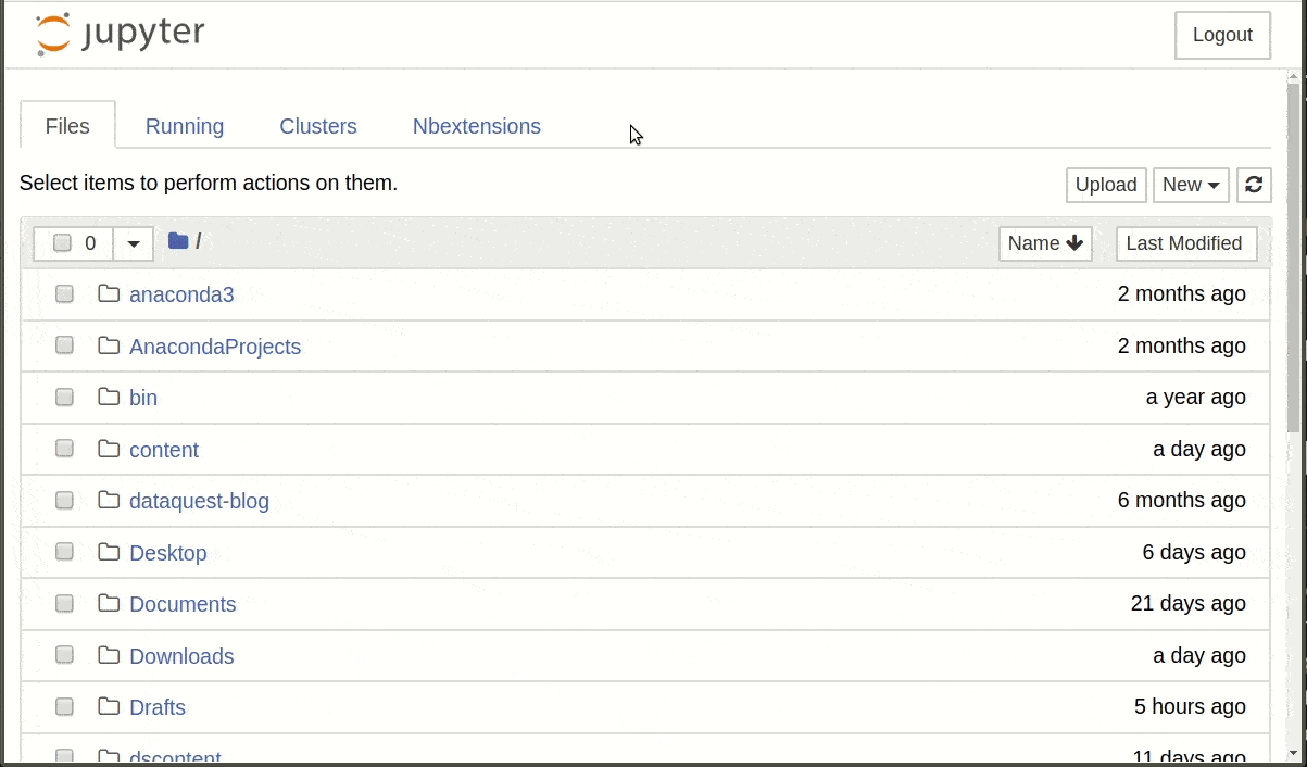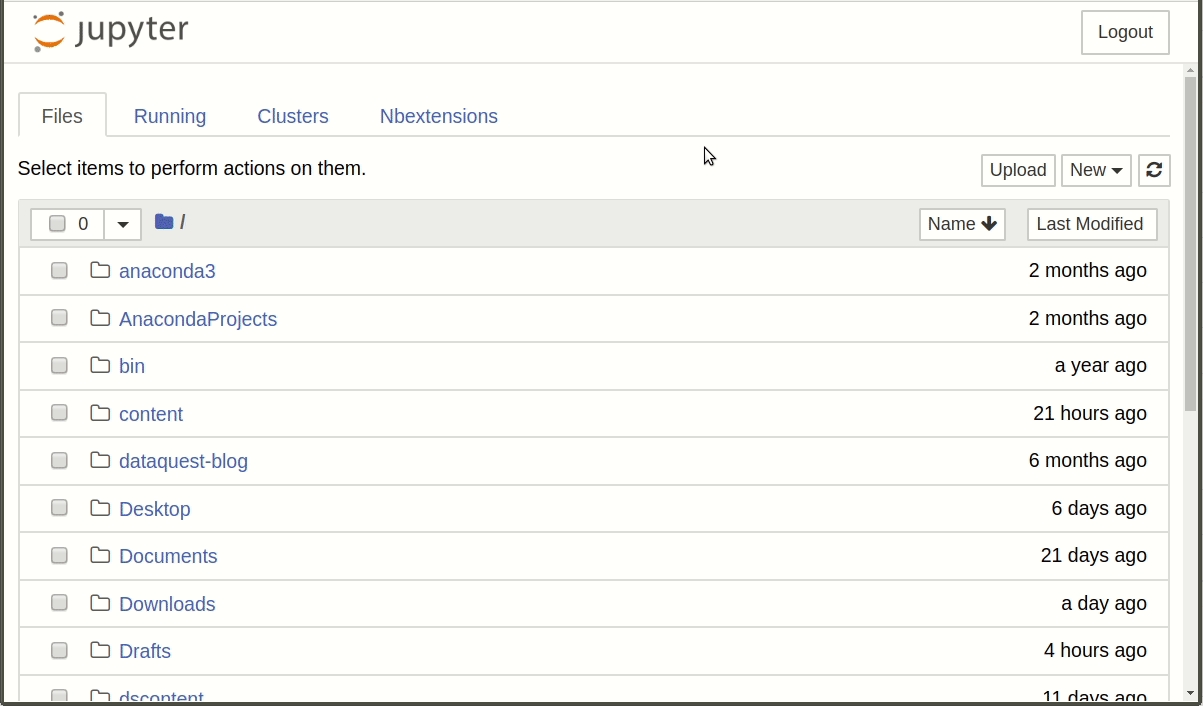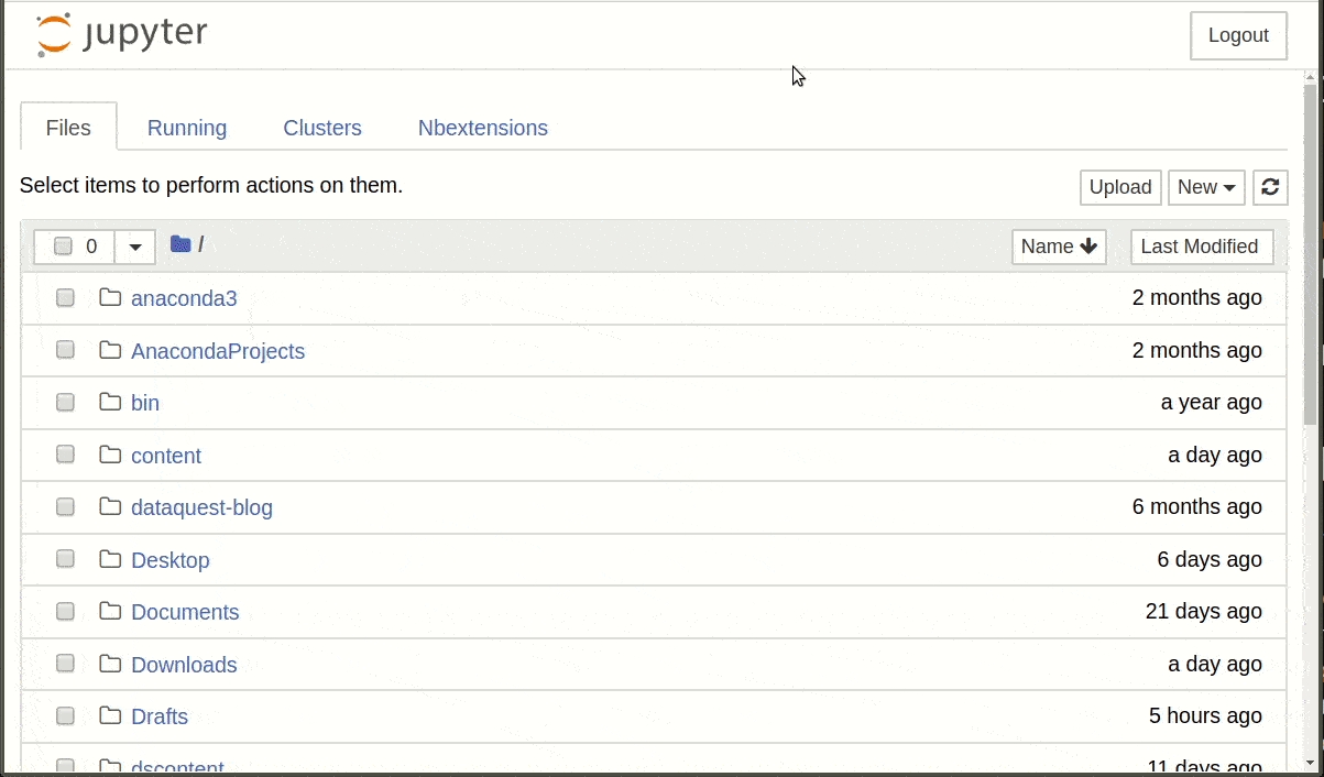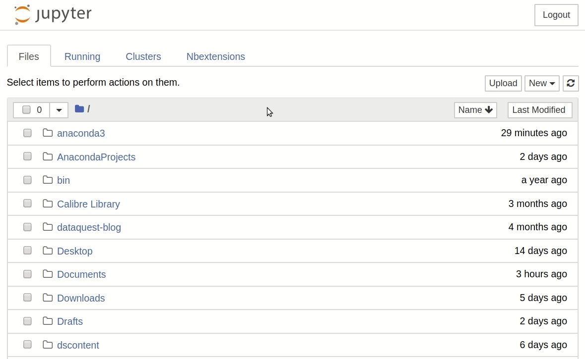 To create a new notebook file, we need to click on the New dropdown menu and then select Python3. This will automatically create and open a new notebook file which we can use to run Python 3 code. After the notebook file is open, you should see the same Jupyter interface that you've been seeing on the Dataquest website.