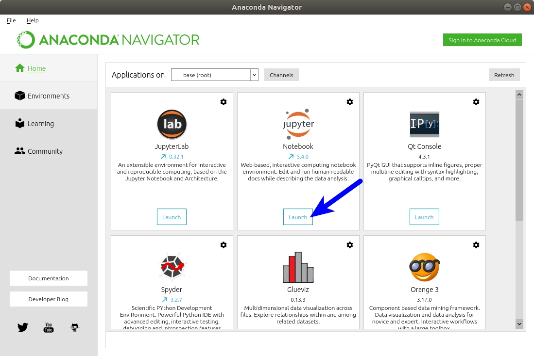 After you finished installing Anaconda, open the Anaconda Navigator by following the instructions here. Navigator's Home screen displays several applications you can choose from — one of them is Jupyter Notebook. Click on the Launch button to launch Jupyter.