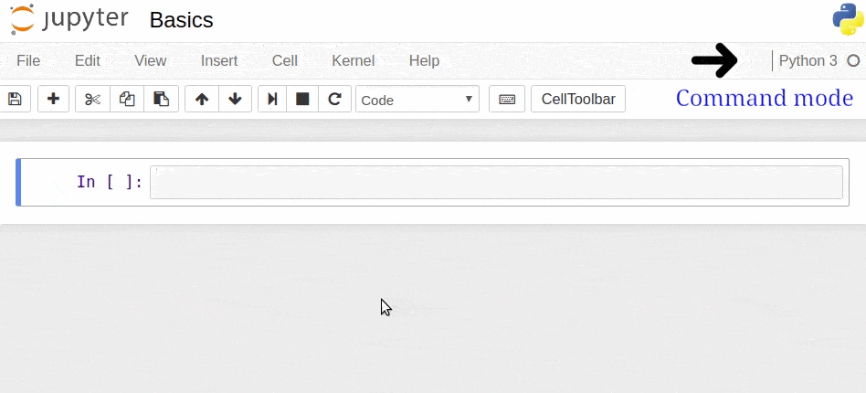 Jupyter is in command mode whenever we press Esc or whenever we click outside of the cell — the pencil to the right of the menu bar disappears.