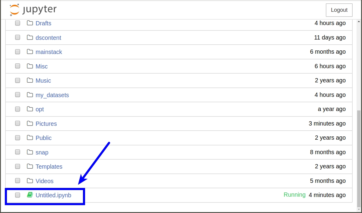 To create a new notebook at /home/alex/my_datasets, we need to access the my_datasets directory from the Jupyter interface, and then we can create the notebook.